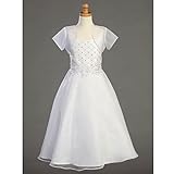 This is a beautiful dress for your little girls First Communion from Lito. Shantung bodice features cris-cross beadwork. The beaded waistline leads to a tea length organza skirt. The sheer organza bolero will help take the chill out of the early spring day.