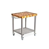 Proteaks serving carts showcase the highly sought-after teak look and performance desired by serious home cooks and kitchen designers alike. The cutting boards end grain construction is preferred by chefs for being gentle on knife blades, while giving the board itself a self-healing property that results in few if any knife marks over time. The beautiful stainless steel base contrasts with the teaks stunning wood grain to create a sophisticated modern aesthetic thats as functional as it is stylish. Proteaks heavy-duty serving carts are made entirely from our environmentally-managed plantations. Stainless base with wheels